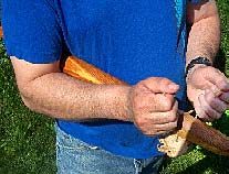 Hold the flute under your arm so you have both hands free to tie the leather lacing very tightly. You might want to sit down and let the flute rest on your lap. Do this each time you play because the leather will stretch. For Drone Flutes: Slide the little wedge under the leather after you have tied it to make it even tighter. |