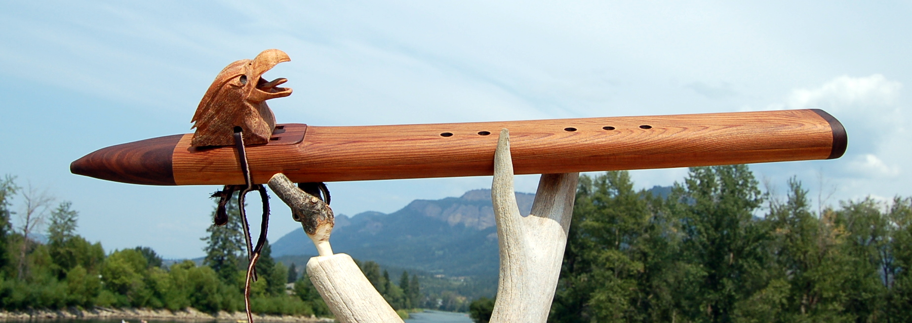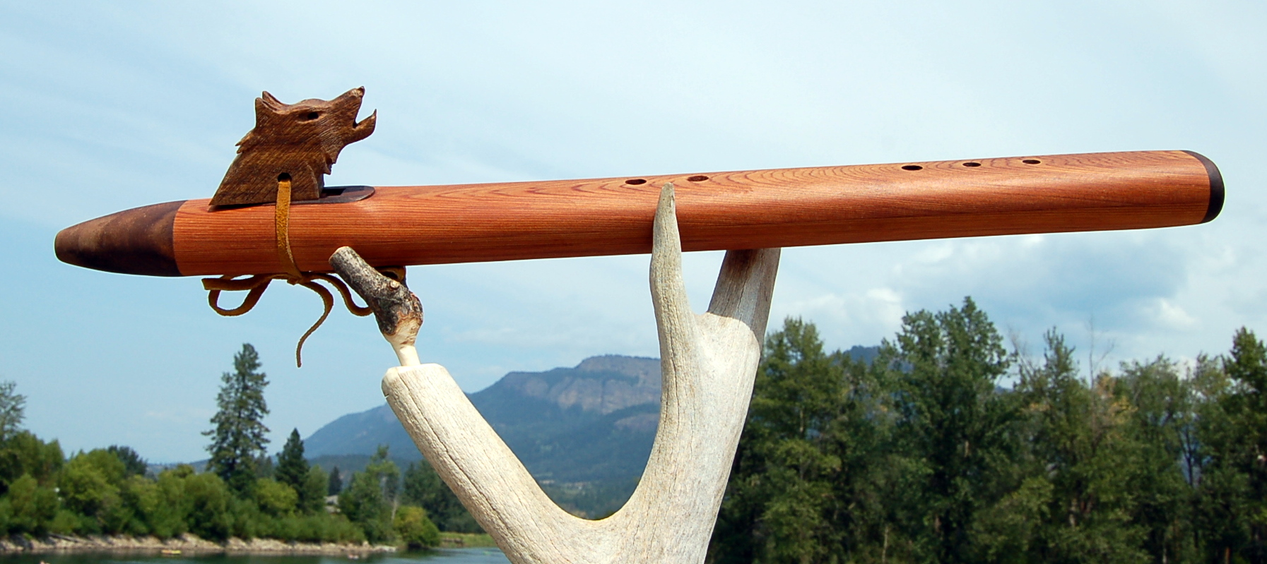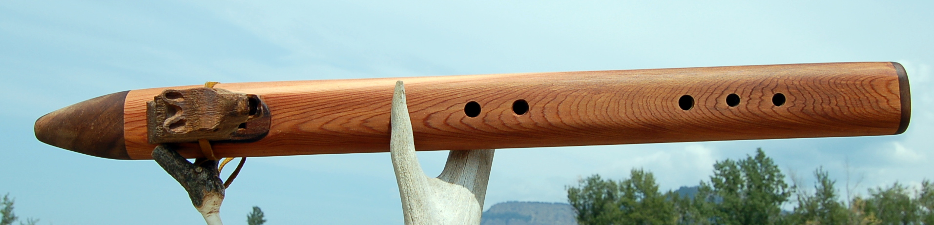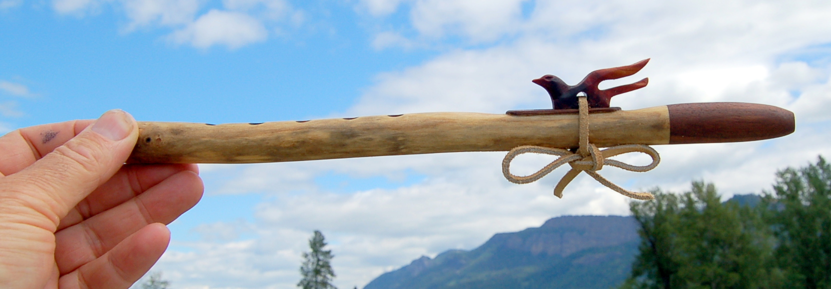I was at a powwow last summer selling my flutes when an elder came over to my booth. He was there to supervise the salmon bake. He looked at my flutes and asked why I didn’t have any made from elderberry wood. This was the wood that his people had traditionally used to make flutes. Looking toward the beach of Okanagan Lake where the powwow was being held, my new friend pointed to an elderberry bush right at the water’s edge and offered to cut me a few of the right kind of branches. I thanked him and accepted his offer. When I got home I set to work making my first elderberry flute with the branches gathered by the elder. On completing my first flute I was very impressed with the tone... rich and earthy. I have since discovered that elderberry is all around me, behind my house, in the forest, down by the lake, along the road. The nice thing, too, is that harvesting it doesn’t hurt the bush. The best wood for the flutes is the third year’s growth which is dead wood. Pruning it off actually helps by giving the bush room for new growth. The inside of the branch is a soft pith, while the outside is nice solid wood. No need to worry about your flute cracking (like bamboo does in dry climates). Each flute is hand crafted and is uniquely different according to the size and shape of the branch. The flute chooses its own tuning. They come in the pentatonic keys of High "F#", High "G", and High "A". A friend showed me a tiny flute that he got from another flute maker. I really liked it so I decided to make some tiny elderberry flutes. These may be small but they have a very loud clear and sweet tone. Take this one to your drum circle and be heard above those noisy drummers. Put it in your purse or pocket so, when you have an uncontrollable urge to play a flute, you have it handy. You could get this flute for a child but they will just make you get your own when you can’t stop borrowing it from them. Ask me how you can save on shipping by buying several of these. They come with wolf, eagle, traditional bird, and feather totems. (See below) Tiny Cedar flutes are similar to the tiny elderberry flutes (above). They are 12 inches long and come in High "E" Pentatonic.