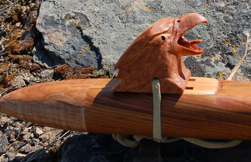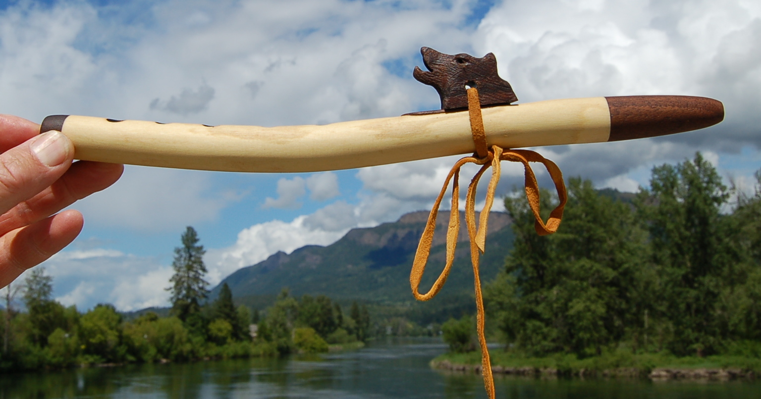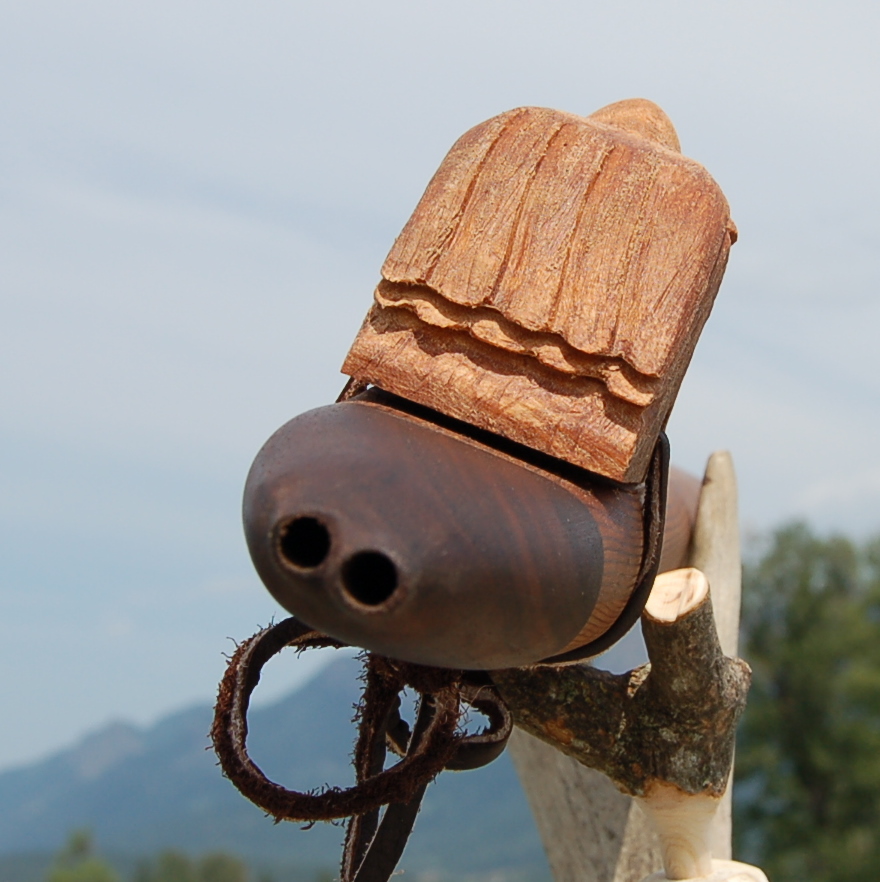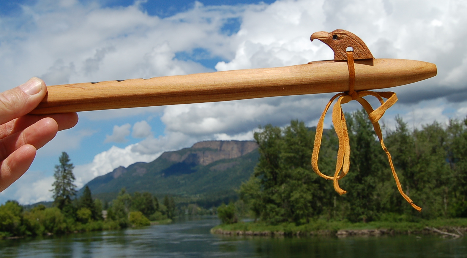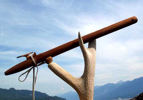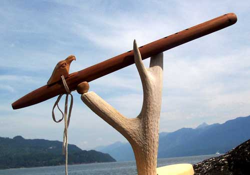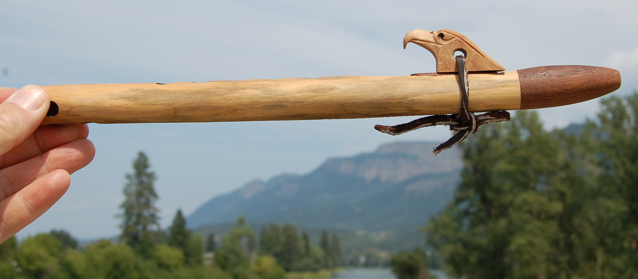 I was at a powwow last summer selling my flutes when an elder came over to my booth. He was there to supervise the salmon bake. He looked at my flutes and asked why I didn’t have any made from elderberry wood. This was the wood that his people had traditionally used to make flutes. Looking toward the beach of Okanagan Lake where the powwow was being held, my new friend pointed to an elderberry bush right at the water’s edge and offered to cut me a few of the right kind of branches. I thanked him and accepted his offer. When I got home I set to work making my first elderberry flute with the branches gathered by the elder. On completing my first flute I was very impressed with the tone... rich and earthy. I have since discovered that elderberry is all around me, behind my house, in the forest, down by the lake, along the road. The nice thing, too, is that harvesting it doesn’t hurt the bush. The best wood for the flutes is the third year’s growth which is dead wood. Pruning it off actually helps by giving the bush room for new growth. The inside of the branch is a soft pith, while the outside is nice solid wood. No need to worry about your flute cracking (like bamboo does in dry climates). Each flute is hand crafted and is uniquely different according to the size and shape of the branch. The flute chooses its own tuning. They come in the pentatonic keys of High "F#", High "G", and High "A". A friend showed me a tiny flute that he got from another flute maker. I really liked it so I decided to make some tiny elderberry flutes. These may be small but they have a very loud clear and sweet tone. Take this one to your drum circle and be heard above those noisy drummers. Put it in your purse or pocket so, when you have an uncontrollable urge to play a flute, you have it handy. You could get this flute for a child but they will just make you get your own when you can’t stop borrowing it from them. Ask me how you can save on shipping by buying several of these. They come with wolf, eagle, traditional bird, and feather totems. (See below) Tiny Cedar flutes are similar to the tiny elderberry flutes (above). They are 12 inches long and come in High "E" Pentatonic.