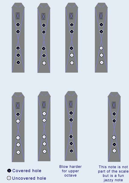 You do not actually blow into this flute. Rather let a good steady breath just flow into the flute from down deep. You can experiment and get different effects by breathing harder or softer. Everyone develops their own style of music with these flutes. There are a number of people that play them professionally. Listening to their recordings might give you some ideas. Two performers that I like are Carlos Nakai and Kevin Locke. Any good music store should have or be able to get their recordings. There might be a Native American Flute circle in your area. Check out the web site of the International Native American Flute Association for listings. Your flute is precision tuned so you can play along with other instruments. If you are getting a lot of "squeaks" or poor tone it is likely that your fingers are not completely covering the holes (or the carved figure is loose or out of adjustment). I started making these flutes because I love the sound of them (I have 24 of my flutes in my own collection). I hope you will enjoy your flute as much as I do mine. Maybe we will get to play a duet someday. General Fingering for Pentatonic Scales